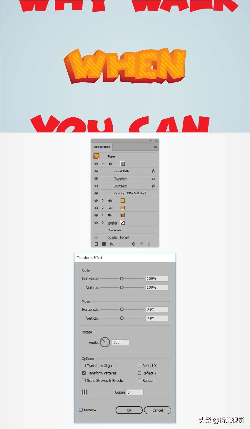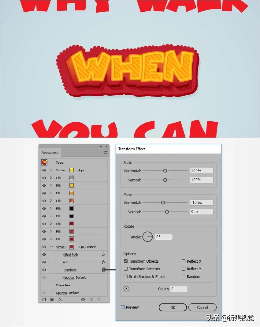 重复上一步中提到的技术,以复制外观属性。完成后,选择其中的一个或多个文本,将焦点放在外观面板上,然后将现有颜色替换为下图中指示的颜色。