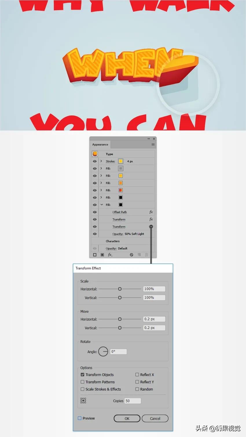 选择底部的黑色填充并使用相同的“ 复制所选项目”按钮复制它。专注于底部的黑色填充并打开第二个“ 变换”效果。只需将份数 从20增加到50,然后单击确定按钮即可。