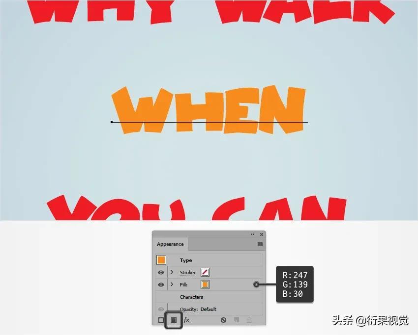 选择一条文本,将焦点放在“ 外观”面板上,然后使用相同的“ 添加新填充”按钮添加新填充。将其颜色设置为R = 247 G = 139 B = 30并确保其位于该“ Characters ”文本上方。将其放在“ 字符 ”文本上方将仅覆盖该红色。