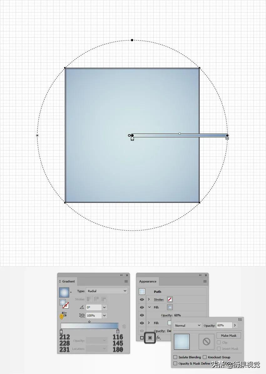 选择新的填充,将其不透明度降低到60%,然后将现有颜色替换为如下所示的径向渐变。请记住,“ 渐变”图像(“ 窗口”>“渐变”)中的黄色零代表不透明度百分比,并使用“ 渐变工具”(G)来拉伸您的渐变,如下图所示。