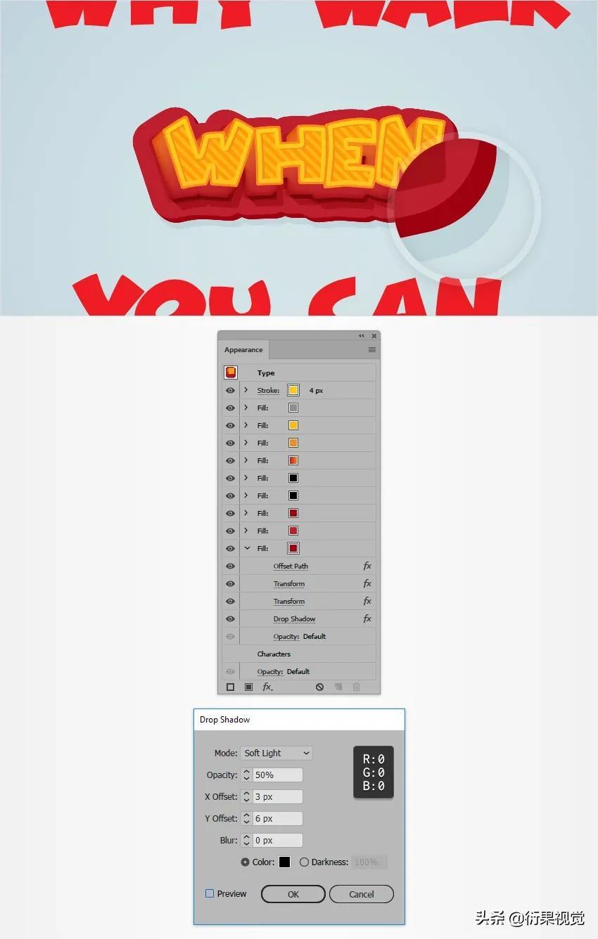 确保仍选择橙色文本,并继续关注外观面板。重新选择该底部填充,然后转到“ 效果”>“风格化”>“阴影”。输入下面显示的属性,然后单击“ 确定”按钮。