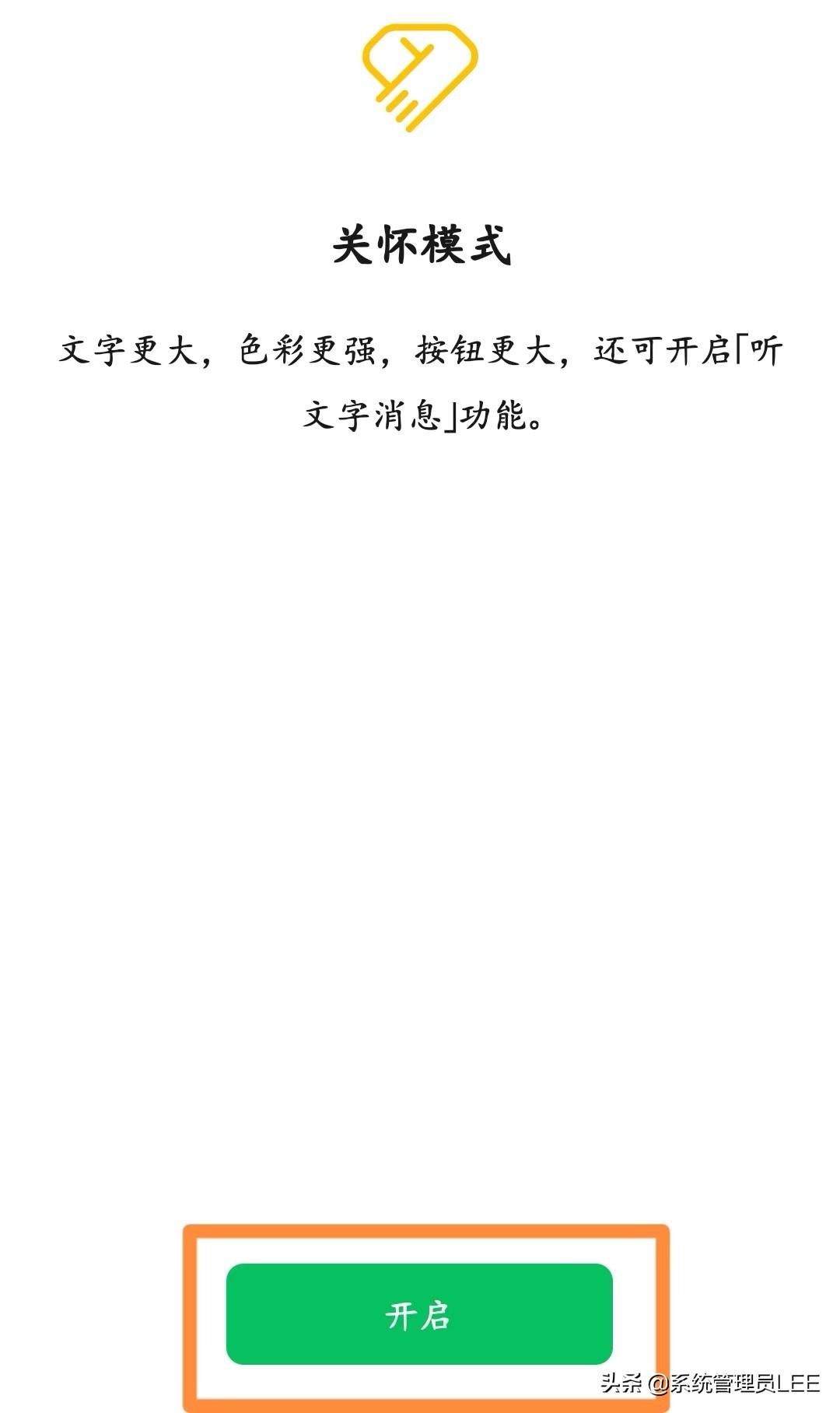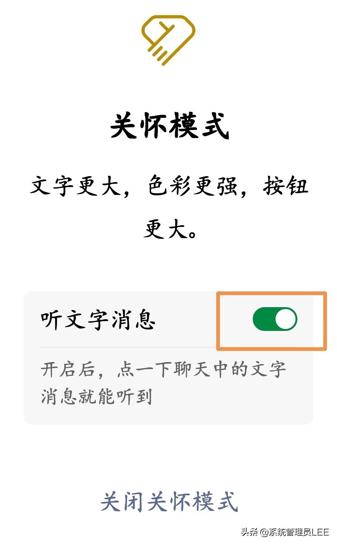 4、 重启后,自动回到关怀模式页面,把听文字消息开关开启