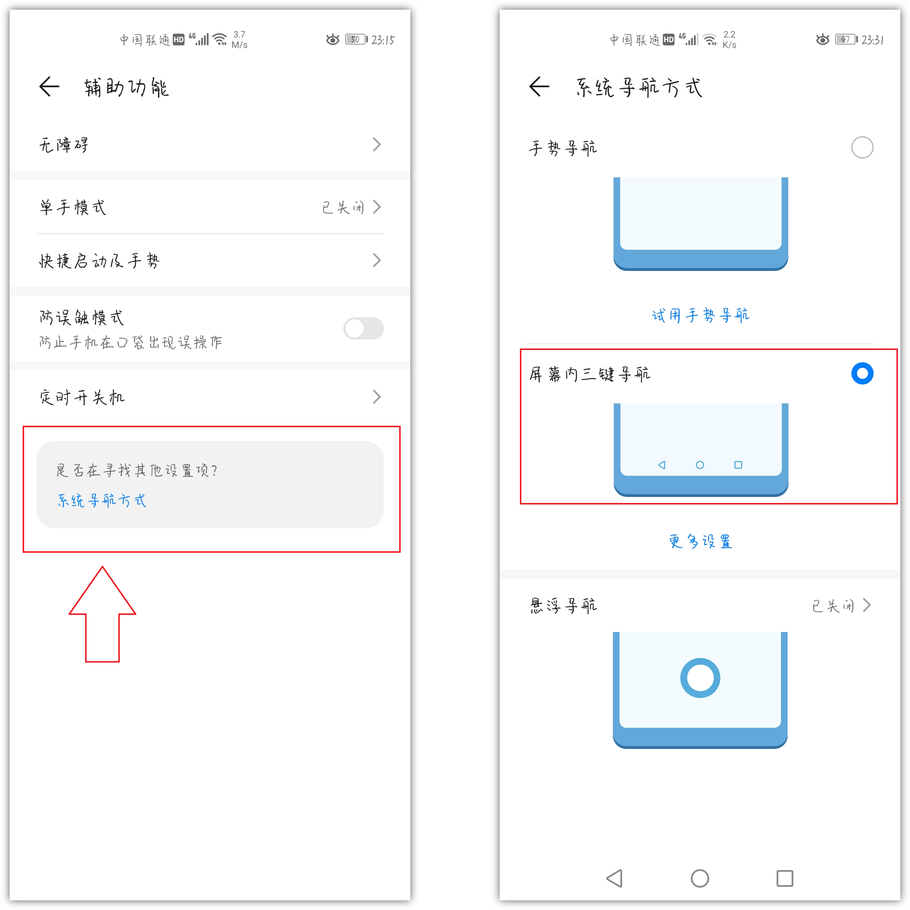 1.打开华为手机的【设置】-【辅助功能】,下方有一行蓝色字体【系统导航方式】,点击进入后,选择第二种方式:屏幕内三键导航。