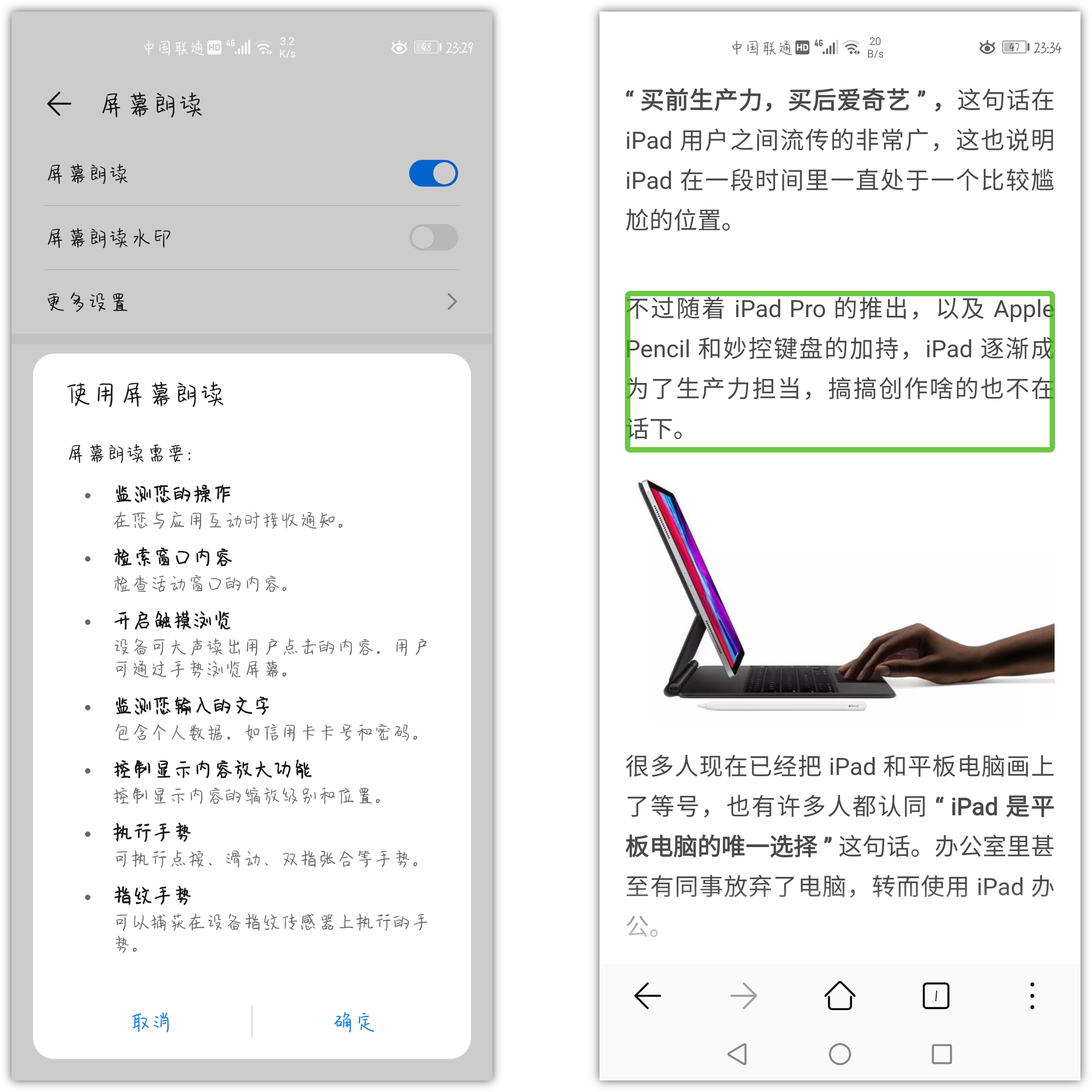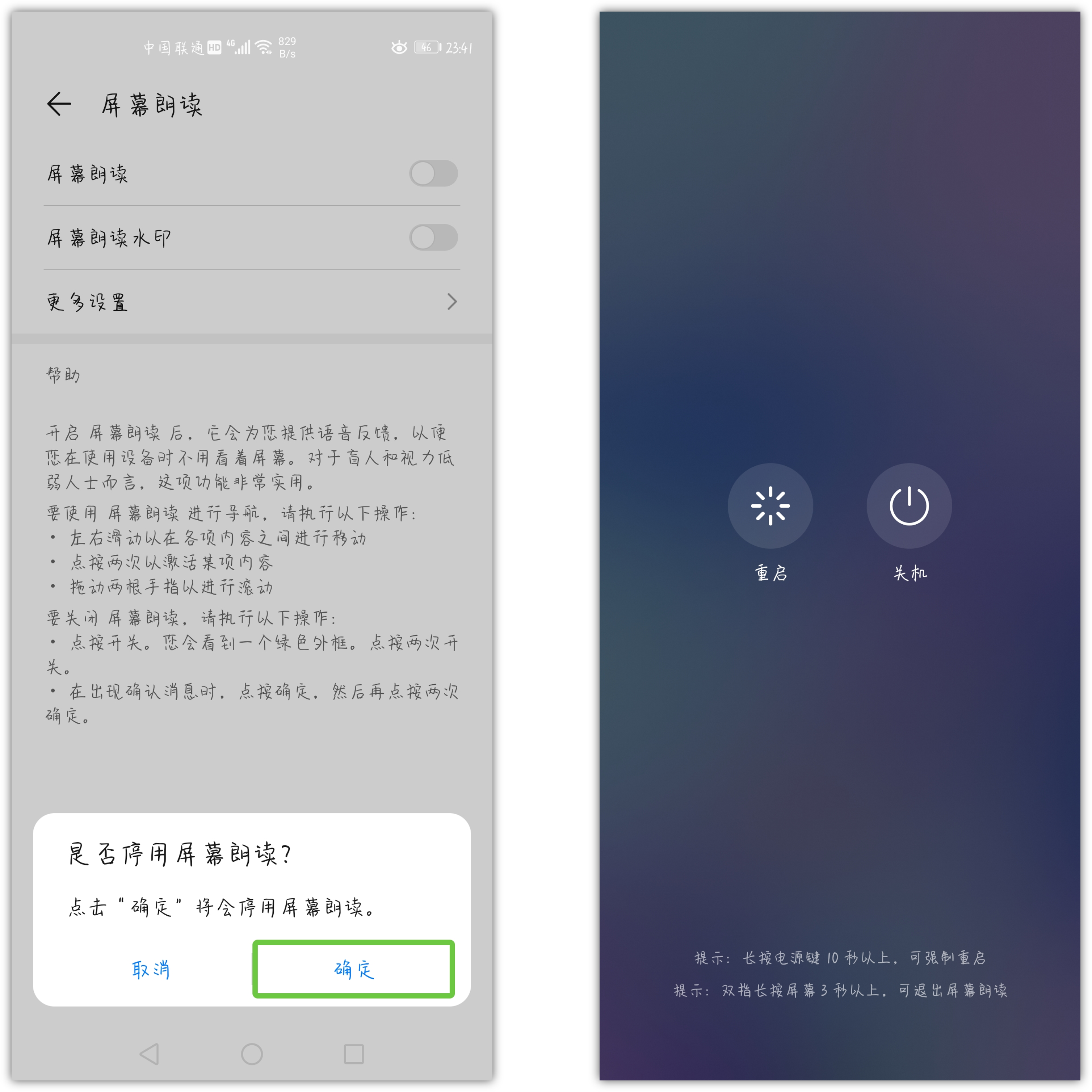5.关闭屏幕朗读的方法:第一种在设置中找到这功能,关闭后面的开关按钮即可;第二种长按电源键10秒,再用双指长按屏幕3秒。