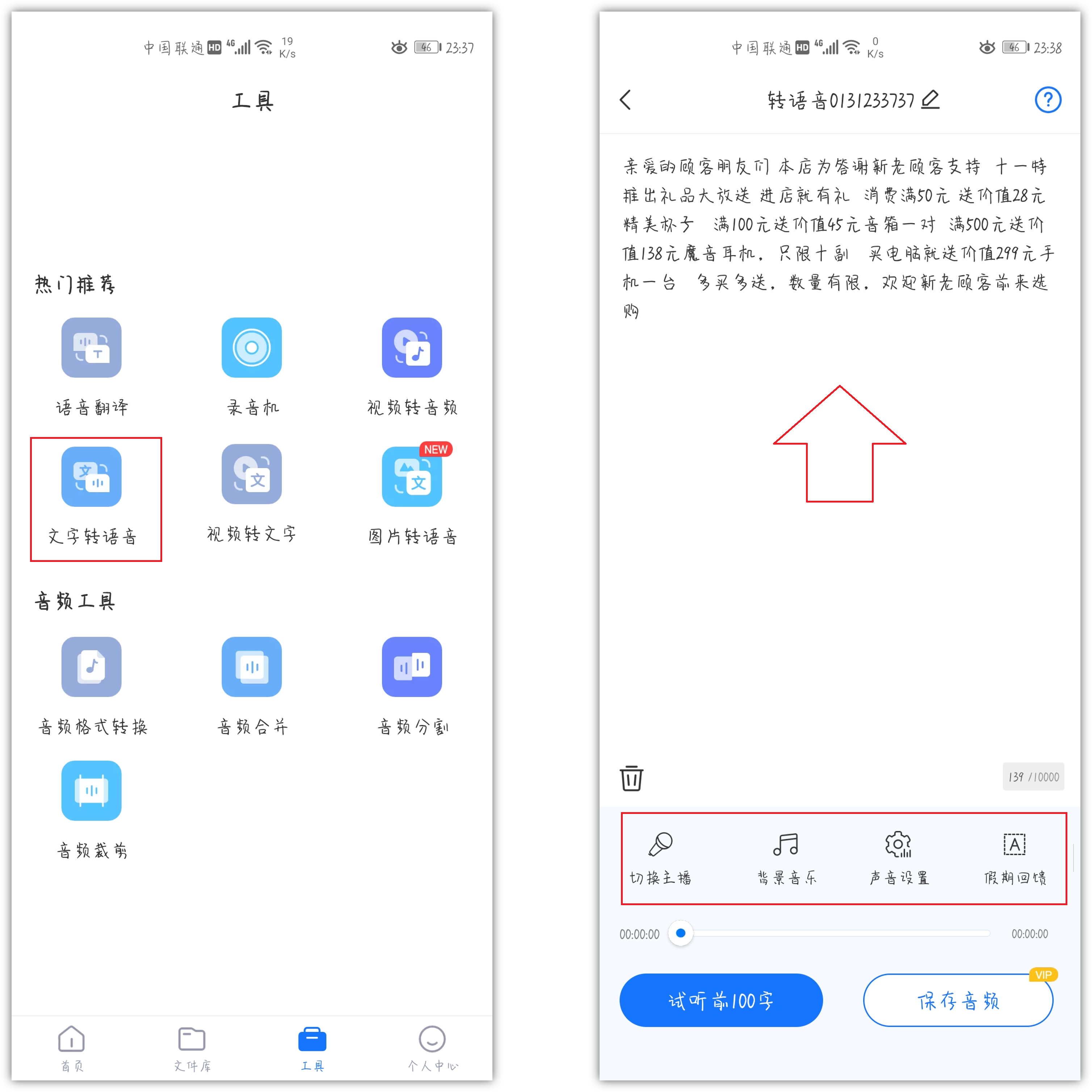 这时候可以用录音转文字助手 ,点击底部的【工具】,选择【文字转语音】功能,你只需要将文本输入进去,就可以转换成语音了。