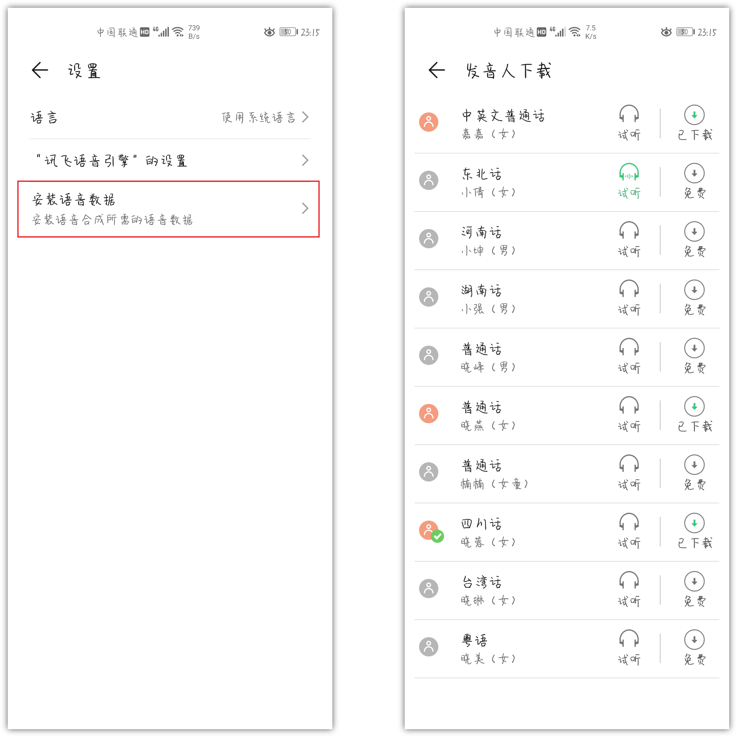 3.接着开始安装语音数据,这上面提供了10种地方语言,可以先试听一下,然后选择下载,最后勾选你一种你需要的语言。