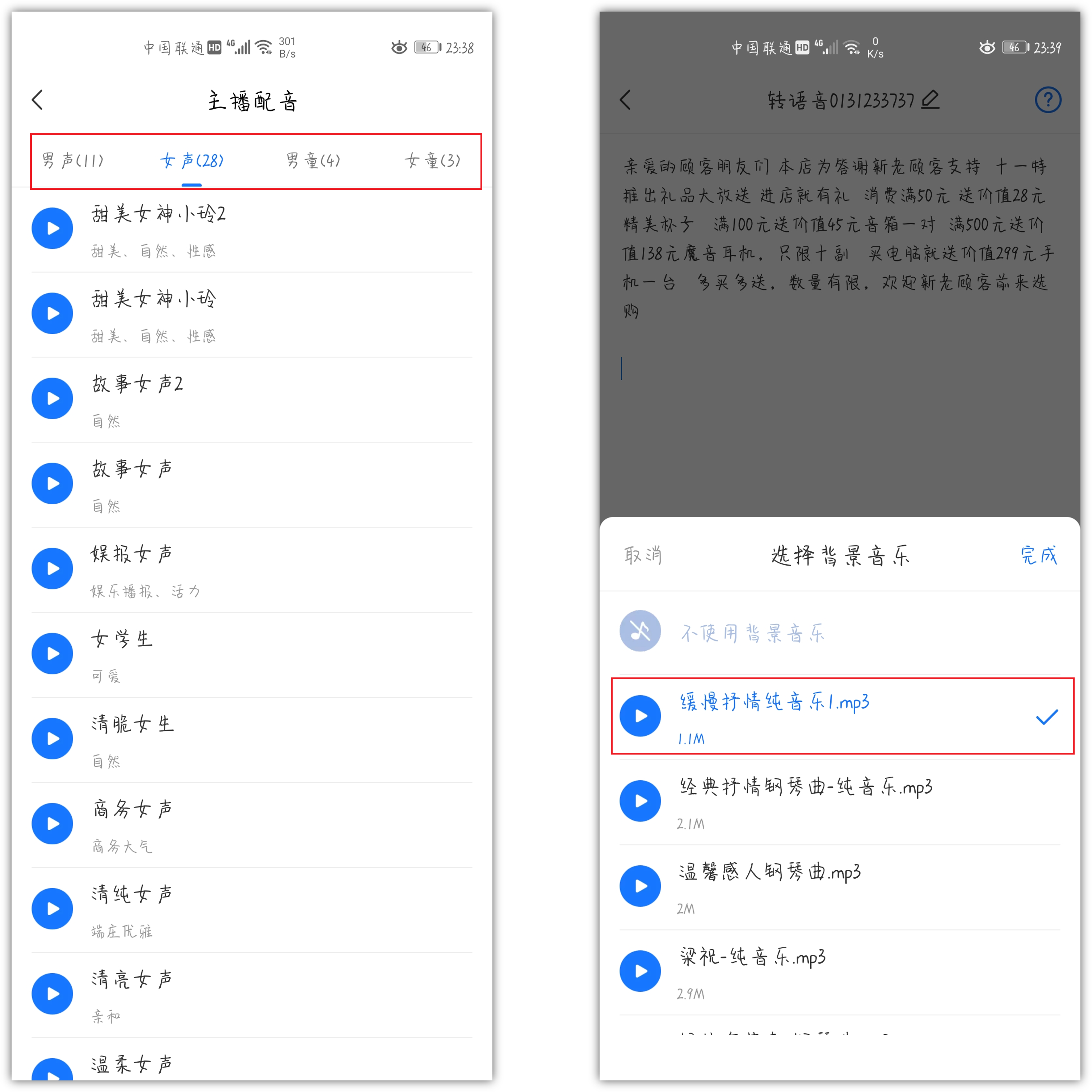 我们可以切换配音,男声、女生、男童、女童的声音都提供了一些,还能添加背景音乐哦。最后保存音频就可以导出这段配音啦。