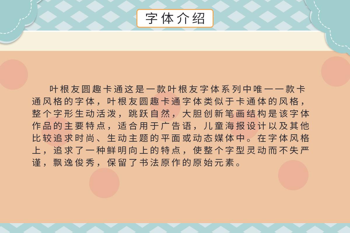 叶根友圆趣卡通是在2010年发表于网络的字体,是一款叶根友字体系列中唯一一款卡通风格的字体。叶根友圆趣卡通字体类似于卡通体的风格,整个字形生动活泼,跳跃自然,大胆创新笔画结构是该字体作品的主要特点,适合用于广告语,儿童海报设计以及其他比较追求时尚、生动主题的平面或动态媒体中。在字体风格上,追求了一种鲜明向上的特点,使整个字型灵动而不失严谨,飘逸俊秀,保留了书法原作的原始元素。