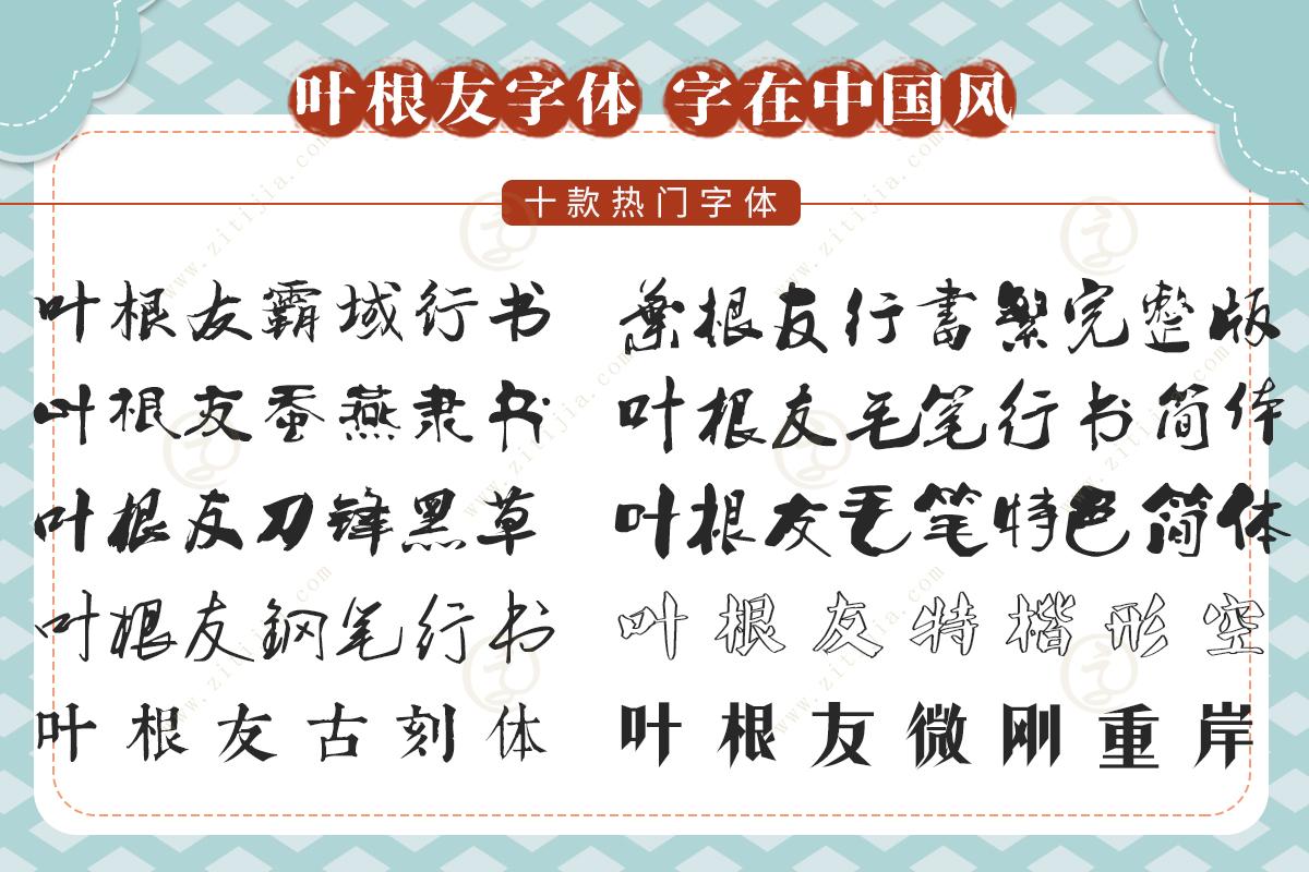叶根友字体起始于2007年,定位手写体,经过十年的发展,已达150多套风格各异的手写体和印刷字体,目前已经成为设计师必备字体,成为字体界继方正、文鼎、汉仪后的一匹黑马。 其中“叶根友疾风草书”、“叶根友刀锋黑草”、“叶根友蚕燕隶书”深受设计师喜爱。