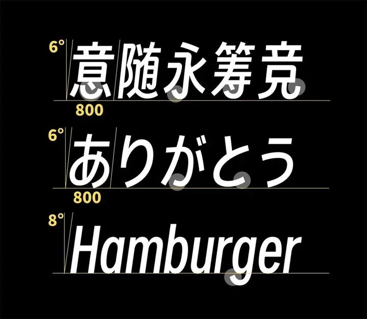 「得意黑」的汉字部分整体倾斜6度,字宽对比全身压窄20%,字形窄长,重心上提,字体整体昂扬着积极的气质 和明快的速度感 。西文部分为了保证混排时视觉一致性而将倾斜角度调整至8度。笔形上,「得意黑」重要特征是大弧线 的弯钩造型,这种极强风格的笔画增添了设计上的难度,但也容易留下深刻的印象 。