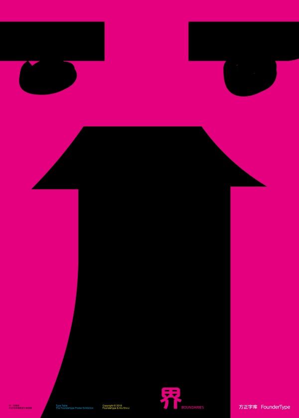 作品描述丨《界》:展览的主题是“字·有格局”,我对格局的理解是不同的边界、界限的组合,所以我把海报的主题设定为“界”字。“方正品尚黑”是一款我没有接触过的字体,当我观察“方正品尚黑”中的“界”字时,有一个非常强烈的感受:当我不断凝望这个字的时候,这个字也在回看我。