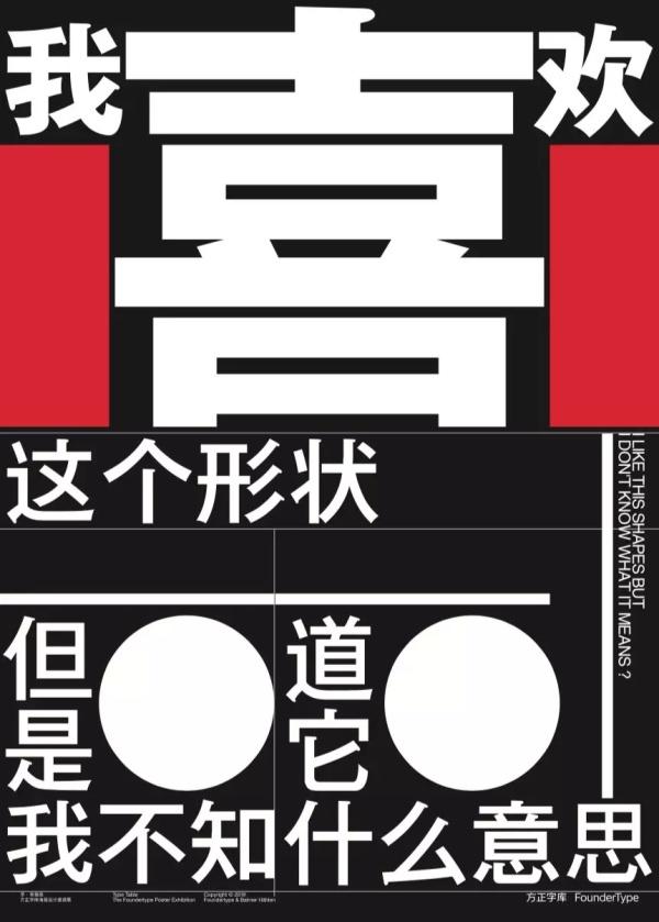 作品描述丨这幅海报突出呈现了方正字库的“方正韵动黑”,我们非常喜欢这款漂亮的字体,但遗憾的是不知道该如何阅读。因此,就出现了将“我喜欢这个形状,但是我不知道它什么意思”这句话作为海报主题的想法。对于我们来说,这次海报设计中的排版工作变成了字体图形和几何形状的排列,这些不同的形状彼此相连,形成有序的视觉效果。