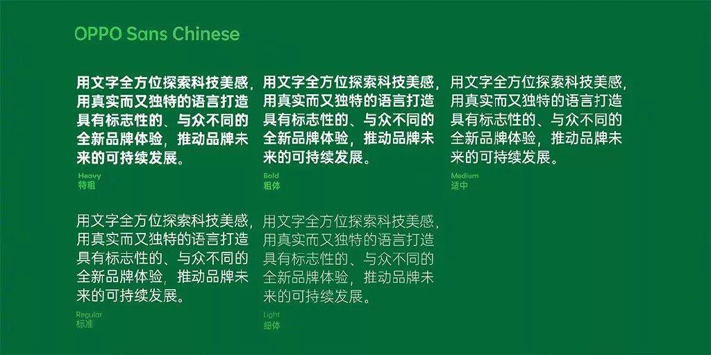 OPPO Sans 家族字体包括Light / Regular / Medium / Bold / Heavy ,OPPO Sans 西文部分,沿袭了新 Logo 中外扩的圆形曲率,将其完美融合在文字体设计之中。OPPO Sans 定位为全球化品牌字体,共覆盖21个国家语言,共11个语种。可以说是字体家族非常丰富了,在苹方,微软雅黑之类的 字体都存在版权和侵权问题的情况下,OPPO这次的福利真的不小。