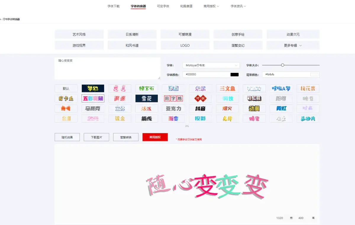 字体转换器不需要单独下载,直接在线制作即可。选择标签后可选择相对应的字体,然后通过滑块调节字体大小,下一步选择字体颜色、背景颜色后,在进行字体特效的选择,在下方实时自动生成字体预览,注册官网账号后,点击【下载图片】即可一键完成下载,一张字体设计图就轻而易举地诞生了!