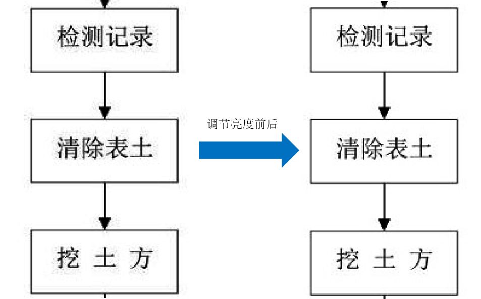 第四步 :调节图像亮度(在变黑和变粗的过程中,由于不是特定的选区,它会使得文字周围变得模糊,文字与空白区域不是特别明显,因此调节亮度拉开黑白对比差距),下面依次为图像曲线处理后放大操作动图、亮度调节动图、亮度调节前后对比图。