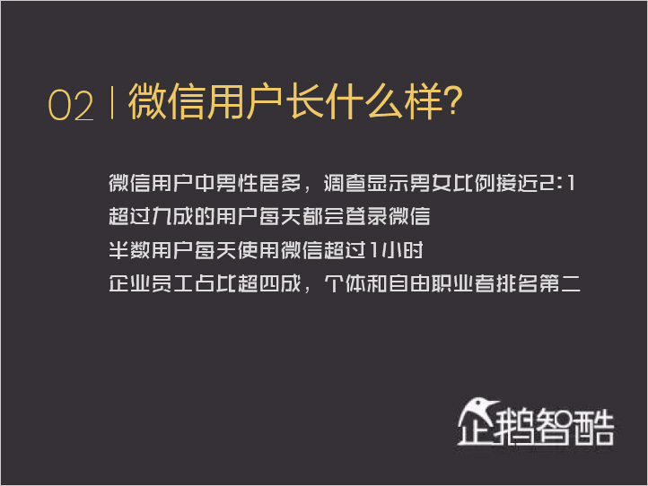 一般情况下,在同一页面下应当保持对齐方式的统一,具体到每一段落内部的对齐方式,还应根据整个页面图、文、形状等混排情况选择对齐方式,使段落既符合逻辑且美观,如下图所示的内容为左对齐(来自搜狐网《企鹅智酷:2016 年最新〈微信影响力报告〉》)。
