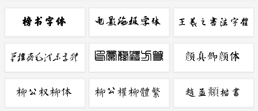 第一字体网(http://www.diyiziti.com/)提供的字体转换器很全,包括在线书法字体生成、艺术字转换器、篆体字转换器、毛笔字在线生成器、隶书在线转换、行楷字体转换、艺术签名在线生成器、POP字体转换器、花体字转换器、卡通字体转换器、手写体在线转换、美术字体转换、在线印章生成器和英文字体转换等。如图2-30所示为第-字体网提供的部分书法字体。