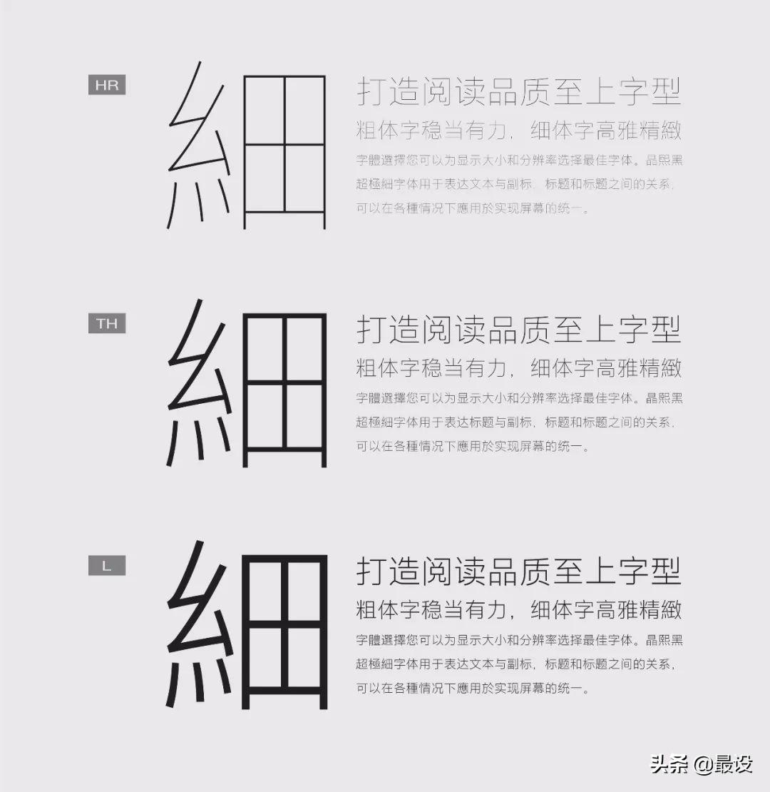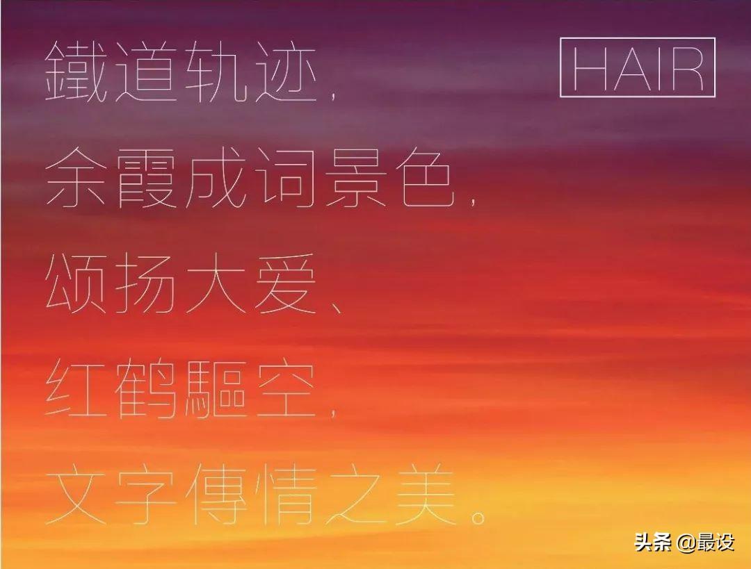 晶熙黑体中最细的一款名为Hair ,笔画像头发丝一般纤细,它可能是我们所知最细的一款汉字字体!这款字体细如发丝却拥有超高的辨识度,其极致的效果惊艳了不少设计师。