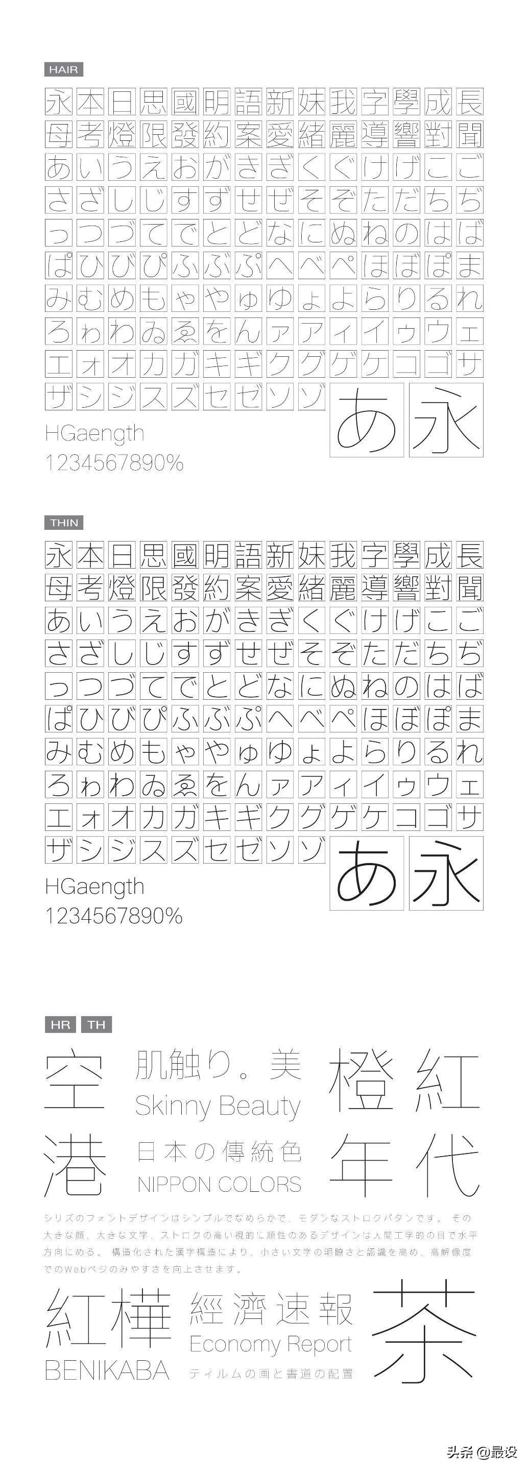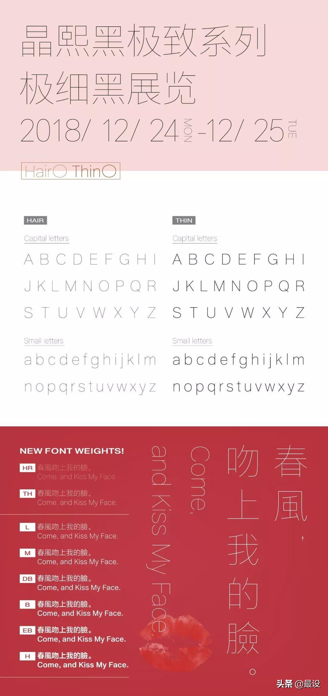 这样一来,晶熙字体家族总共就有12款字重了,从笔画像头发丝一样极为纤细的Hair,到份量感十足难以忽视的UltraBlack。