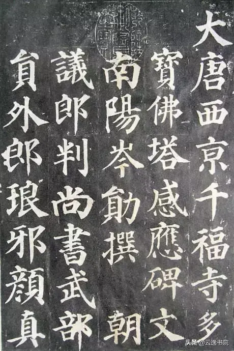 此碑首题“大唐西京千福寺多宝佛塔感应碑文。”正书三十四行,每行六十六字。天宝十一年(公元752年)刻於陕西兴平县千福寺,宋代移西安碑林,今尚存。楷书,高285厘米,宽102厘米,为岑勋撰文,颜真卿书,史华刊石。反映的是他早期的书法风貌,字体工整细致,结构规范严密,用笔一丝不苟,因而这方碑石也是后人初学楷书最通行的范本。