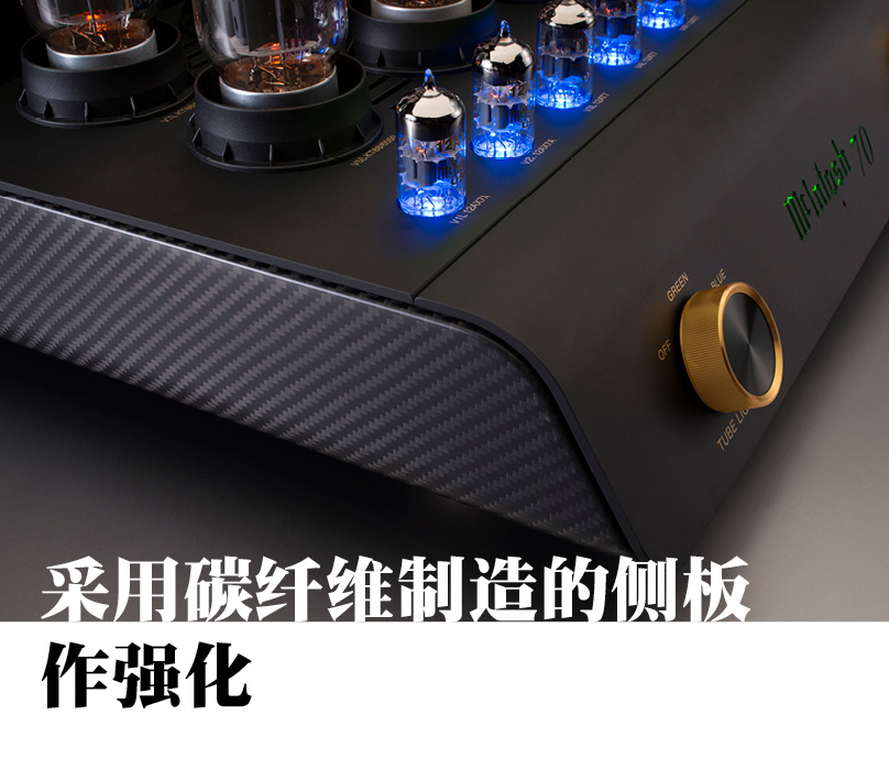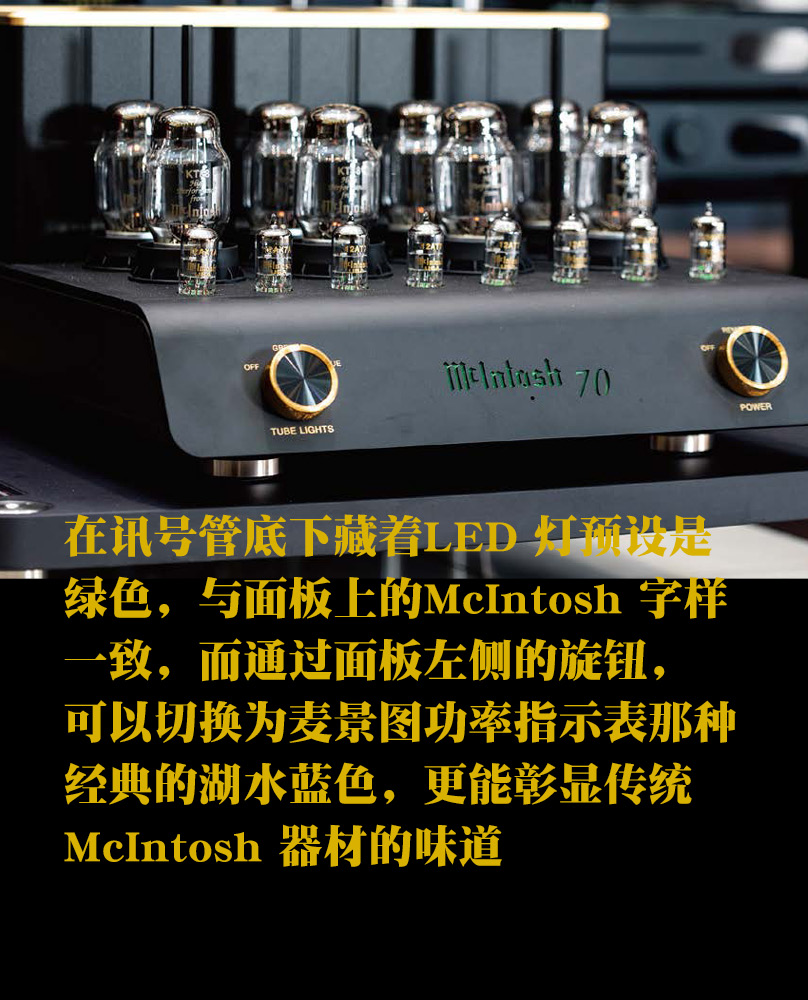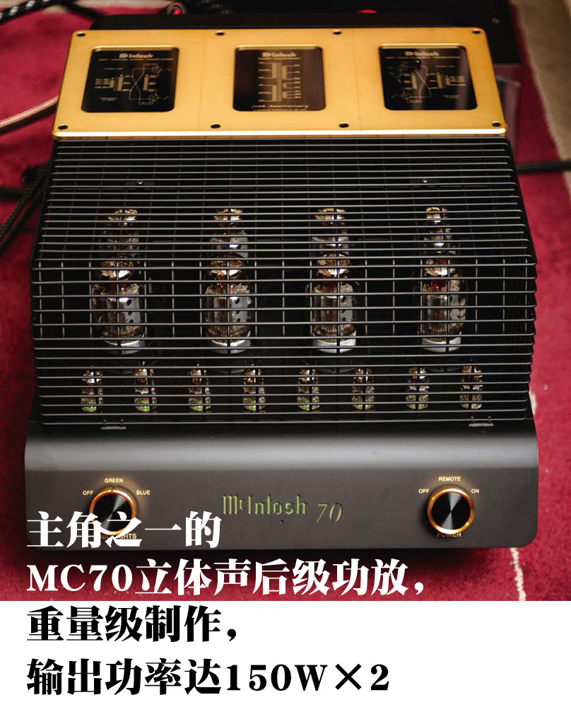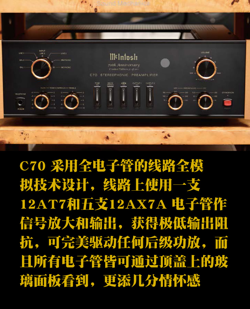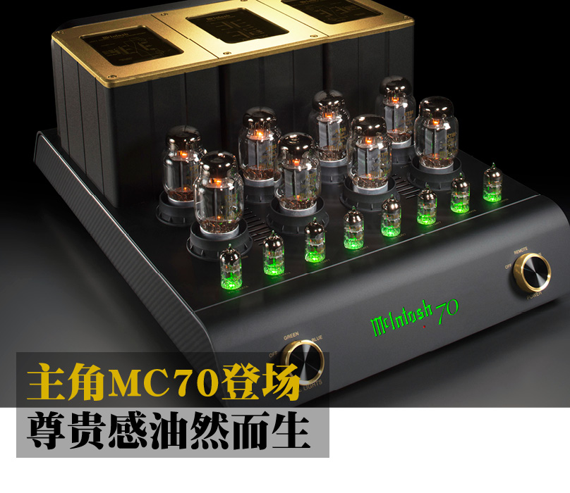 前面板两侧是麦景图经典的金属包边金色旋钮,引人注目的全新外观设计既有传承也有创新,在机器的旋钮金属包边以及变压器罩上盖均电镀真金,令外观更显雍容华贵。新设计的喷砂黑色阳极氧化铝底盘设计也是新特征之一,结合采用碳纤维制造的侧板作强化,让整部机器相当扎实,有效确保不会产生谐振干扰电子管正常工作。作为纪念型号的MC70,继承了McIntosh麦景图由电子管功放创业的历史与传统,选择了全电子管全平衡放大线路设计,前级为严谨配对的4只12AX7和4只12AT7,在底座前一字排开很有阵势,而推动级为8只KT88。