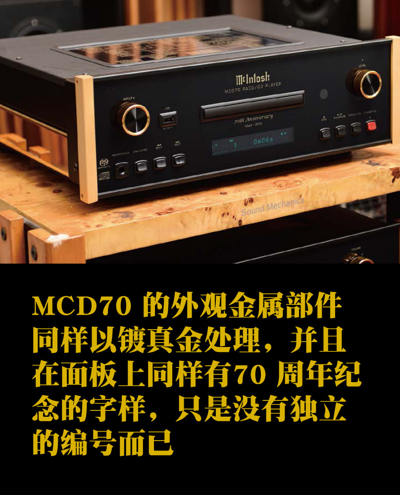 同时间,McIntosh还发布了为搭配70周年限量纪念金版功放MC70/C70组合而特别推出的MCD70限量版播放器。MCD70的外观金属部件同样以镀真金处理,并且在面板上同样有70周年纪念的字样,只是没有独立的编号而已。在功能上,MCD70为真正的SACD/CD 播放机,采用与Denon合作开发的SACD读碟机构,可对应时下所有类型的音频光碟。其精密压铸铝托盘提供平稳安静的运作,而先进的数码伺服技术提供快速、安静和准确的操作。
