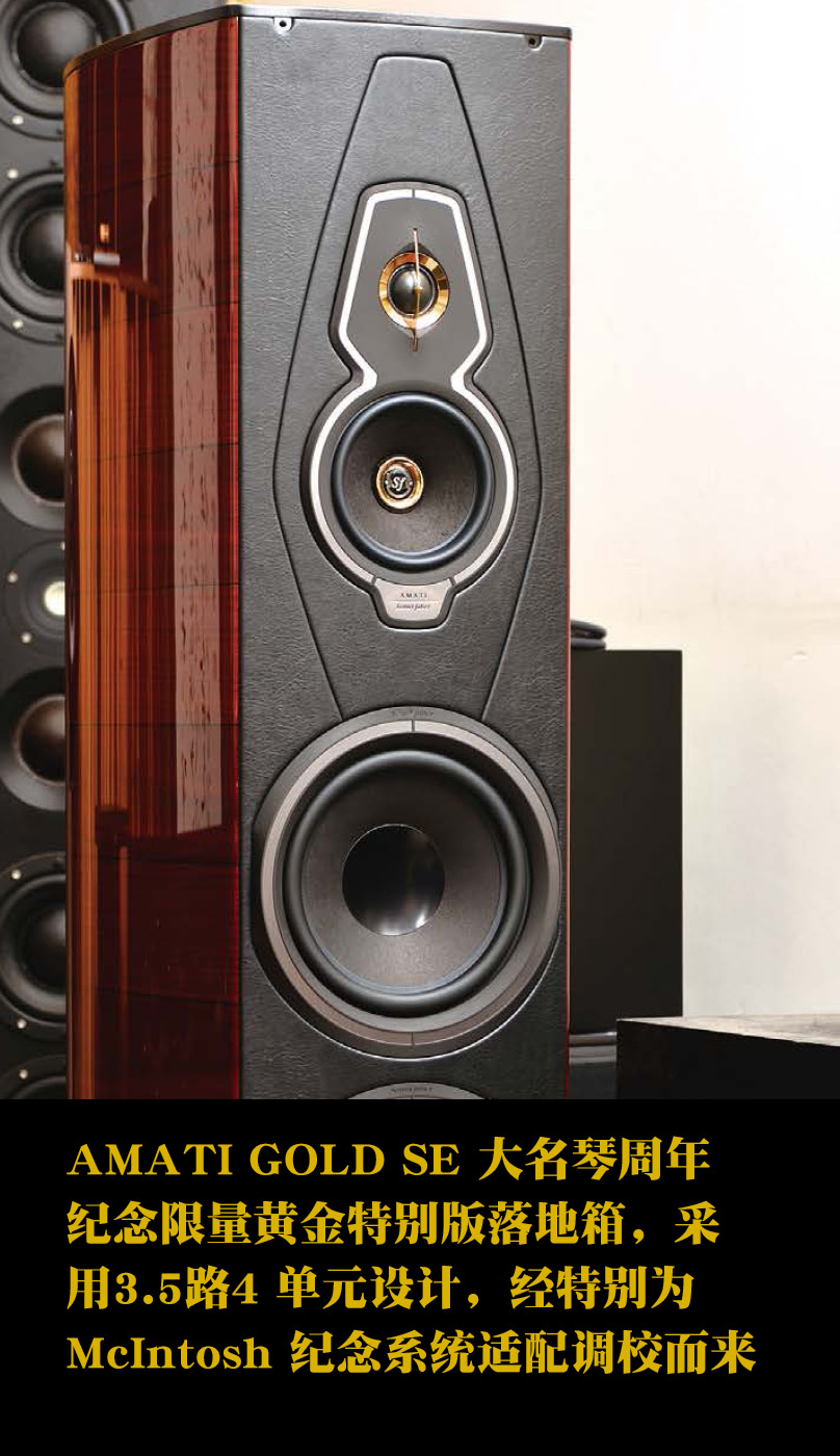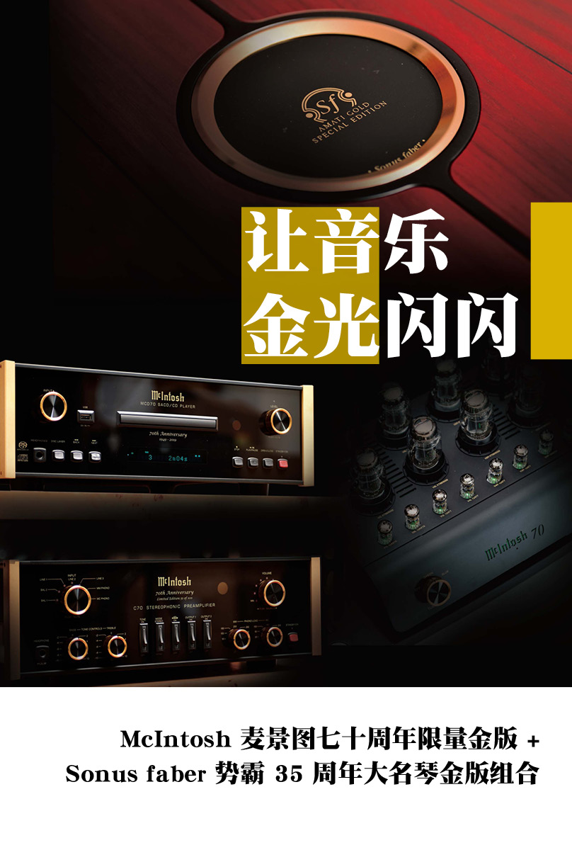 随着McIntosh 麦景图迈过70周年,同一集团的另一个世界顶尖音箱品牌意大利Sonus Faber势霸也迎来了自己的35周年庆(1983-2018 年)。因此两个品牌都同时有大动作,McIntosh 发布了上述的C70 GOLD LE、MC70 GOLD LE、MCD70 GOLD LE和MT70 GOLD LE之外,Sonus Faber 势霸则发布了AMATI GOLD SE 大名琴周年纪念限量黄金特别版落地箱,而且这款音箱也为了完美匹配MC70/C70纪念组合,经过了Sonus Faber设计师在原本名琴传承AMATI的基础上重新设计了分音器适配调声而来。这款名贵的音箱也限量35对,只有购买MC70/C70限量纪念组合时才可配套购买,不设单独零售。