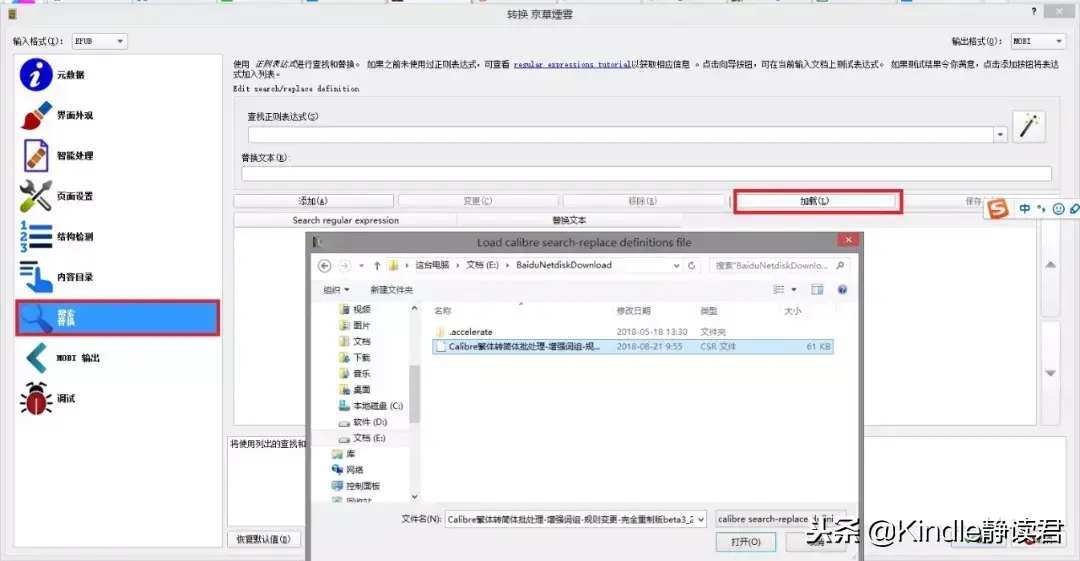 4、点击左侧的“搜索替换”,再点击“加载”,在弹出的对话框中,选中之前下载的转换规则词库文件,