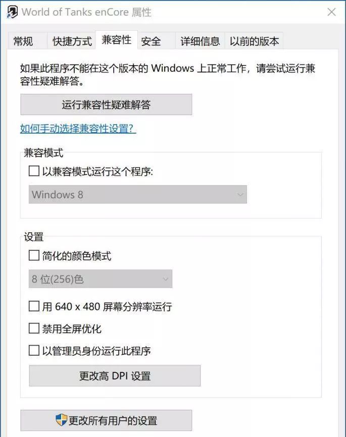 此外我们还可以针对单个应用程序进行缩放设置优化。在想要设置的程序快捷方式上用鼠标右键选择属性,在“兼容性”选项卡下,点击进入“更改高DPI设置”。