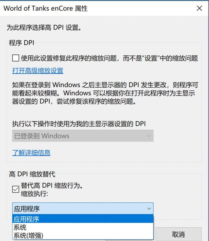 勾选“替代高DPI缩放行为”,在下拉菜单中选择“应用程序”,可以有效缓解缩放导致的应用程序显示虚化问题,但由于程序开发不合规等问题(没有按照微软标准API接口执行),有的程序界面会变得极为怪异,出现类似的问题,只要将下拉菜单中的选项改成“系统(增强)”即可。
