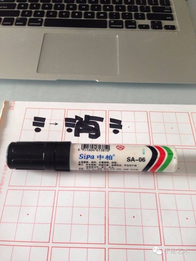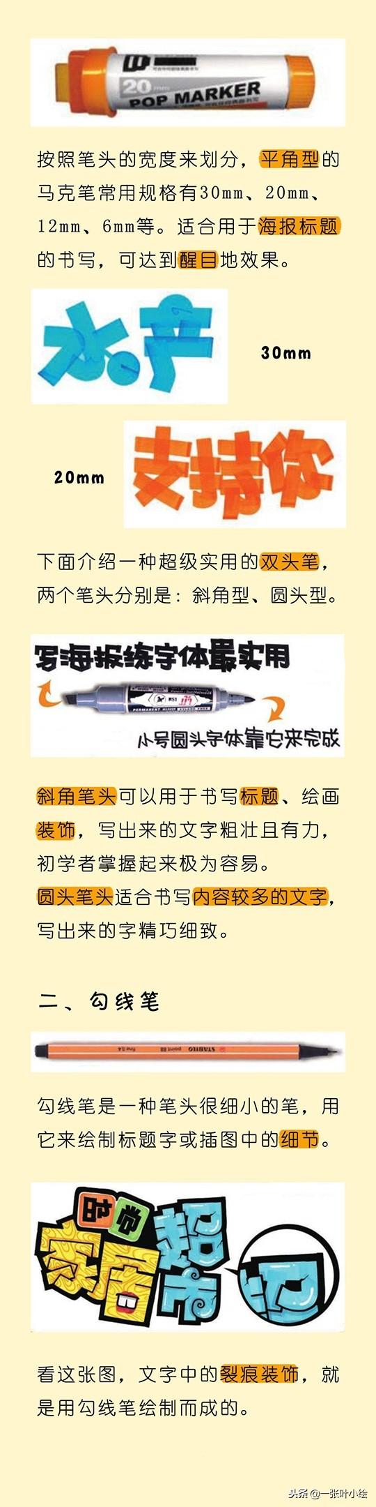 1、书写这样字体有两种笔型,一是大双头的记号笔斜头,规格通常为3mm、4mm、5mm、6mm,另外就是上面图片的这种6mm专业马克笔。