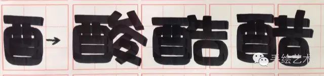7、酉旁:看到很多写成西旁甚至不知道怎么去写这个偏旁。里面可以书写两竖和两横就可以了,如果还不了解的建议查阅下隶书或者篆书的结构笔法由来。