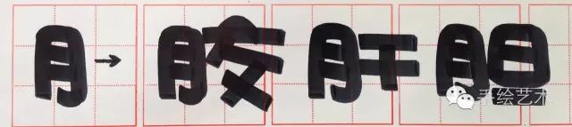 4、月旁:这个偏旁结构写得有些松散,主要是因为左撇靠左正常化书写了,应该将左撇靠右一点点这样便于笔画及结构的紧凑性,里面的两横也是往右下横笔书写的,如果外框书写小了我们可以将内在的第一横书写斜点(详情见我们的网站www.shouhuipop.com)里面很多这样的字体范例。与月旁相关的字体左右结构都是一样的笔画少的偏旁写小笔画多的写大,如上面的肝、胶。少笔画的应在多笔画的中间,多的应在少的上下都需要占一定的高度。