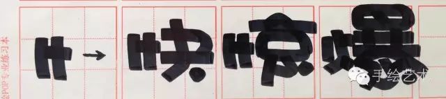 3、竖心旁:两竖书写的笔法是一样的,从上往下,但是都是要往右靠倾斜,上面的点笔画方向往横向右斜下书写。这样的偏旁同样写在多笔画的中间,不要与多笔画的上面和下面进行平行,特别是爆这样多笔画的时候大家书写时一定是先超火旁的顶部。这样便于下面的结构不会过于的往下面垂。