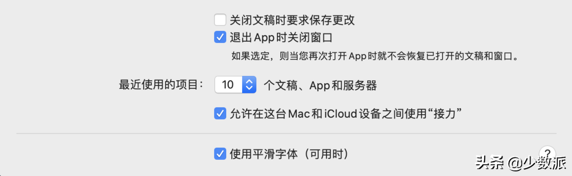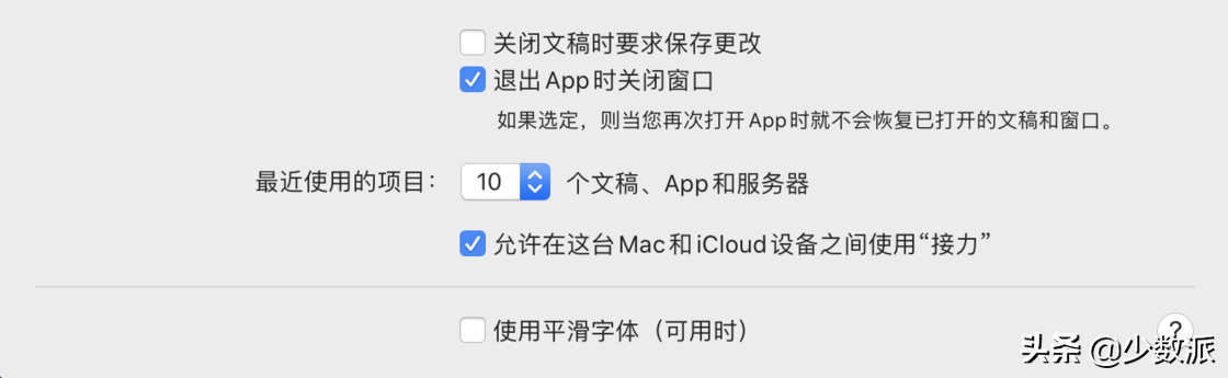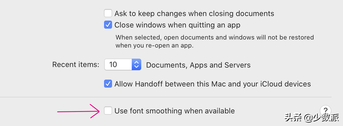 这个设置的名字比较误导人。原先这个选项叫做「LCD 字体平滑」,表示的是次像素抗锯齿。但是 Apple 在 2018 年就将次像素抗锯齿的功能从 macOS 中移除了,并在同一时间淘汰了最后一代非视网膜屏 MacBook。