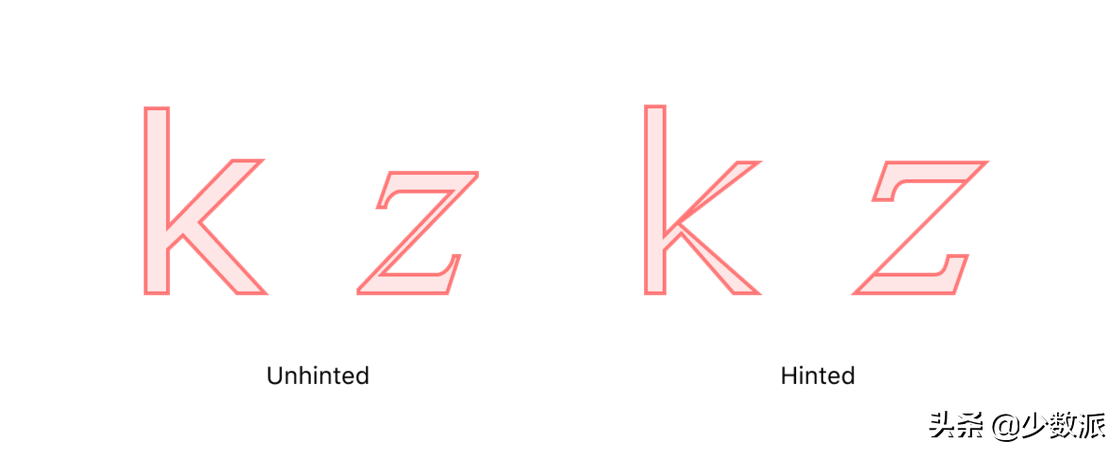 字体 hinting 最大的问题,其实是这个渲染策略会损失字符本身的形状。像素点不会被渲染到其本该在的位置,而是被渲染在像素格子里面。一个例子: