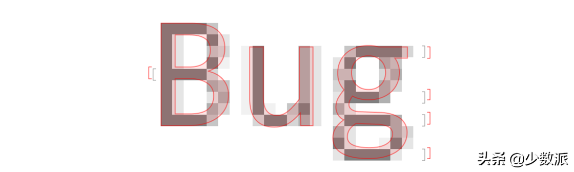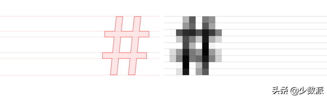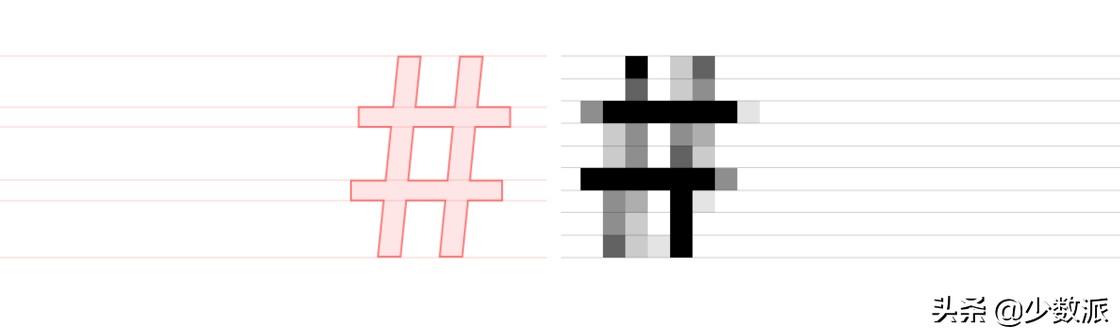 看到竖向的字符笔画跟实际矢量图格式的子图相差多大了吗?这里的误差几乎有 ¼ 个像素那么大。