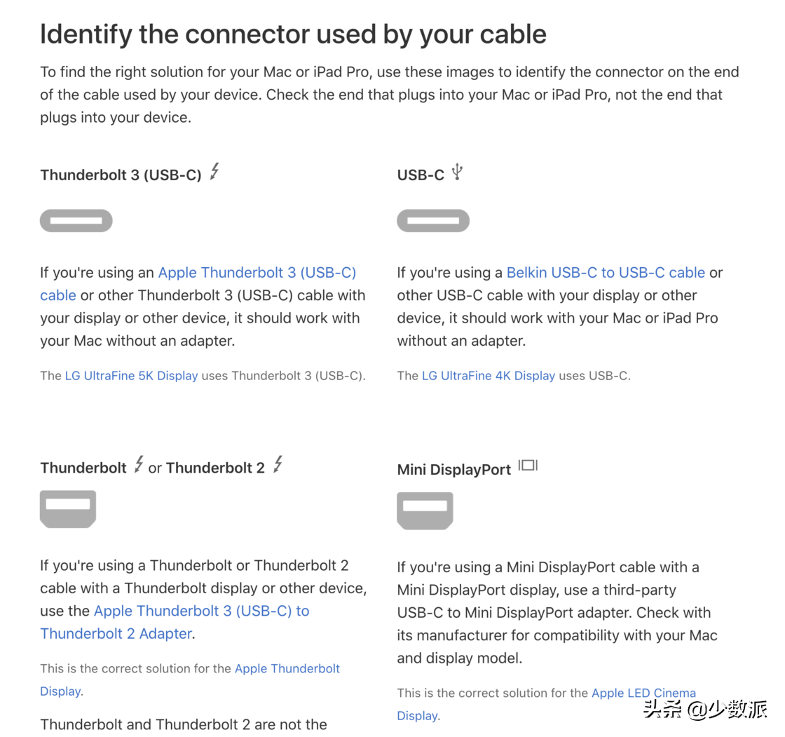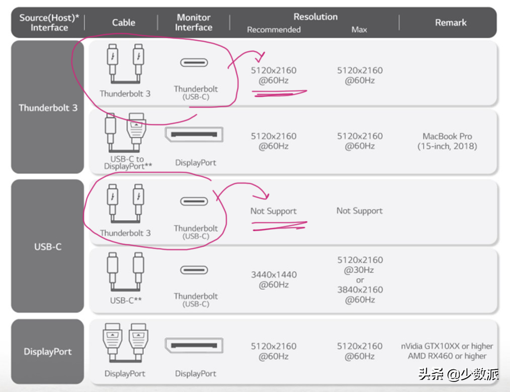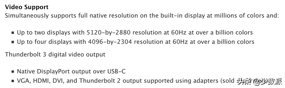 4K 120Hz 需要 3840 × 2160 × 3 bpp × 120 Hz × 8 = 24 Gbit/s 的带宽。刚刚稍微低于 DisplayPort 1.3 / 1.4 的 25.92 Gbit/s;HDMI 2.0 仅支持 18.0 Gbit/s,所以我们必须用 DisplayPort;雷电 3 的接口可以支持 DisplayPort 1.4,所以只要我能找到合适的适配器,那我就应该可以完美解决这个问题了。我 MacBook 支持哪些接口呢?简单!看看这张 Apple 官方提供的对照表: