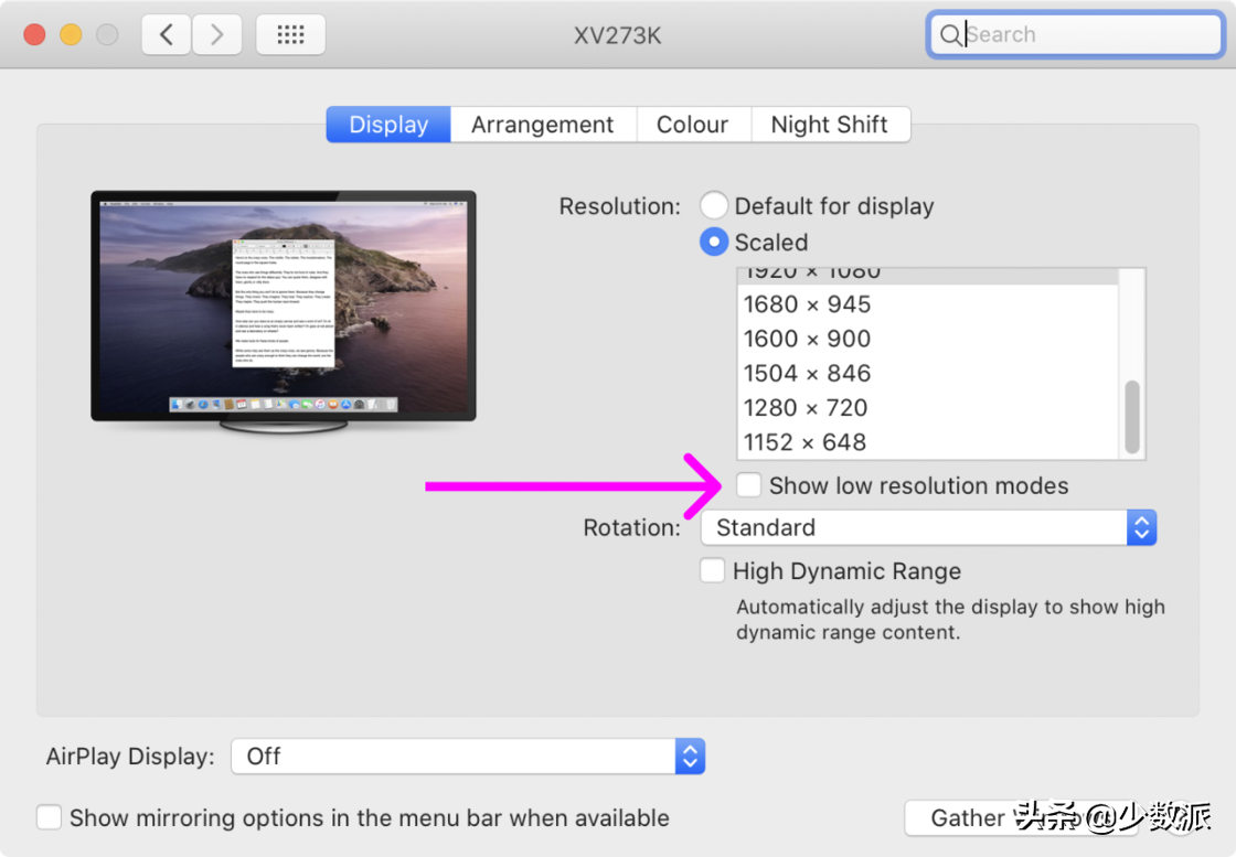 对我们来说,幸运的是,这个事情(暂时)还是比较好处理的。在 macOS 的「系统设置 - 显示器」里面,取消勾选「默认」并选择二倍分辨率的选项: