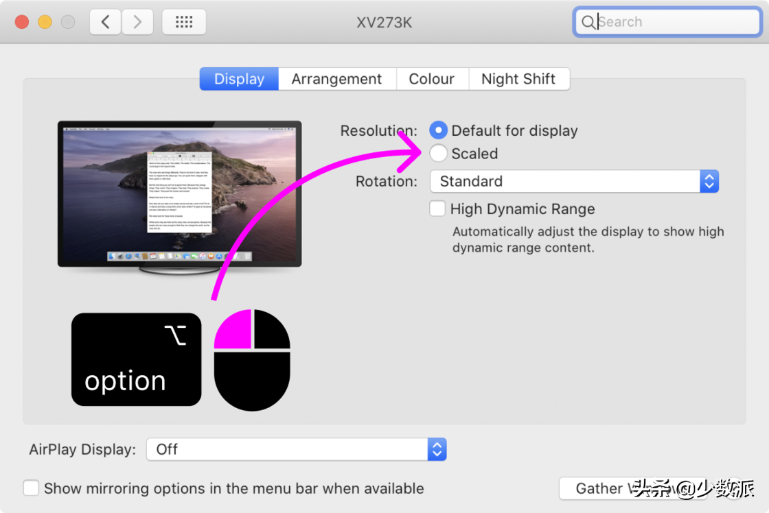 至少应该是 4K 显示器。5K 和 6K 显示器当然更好 1 ;必须使用整数倍的缩放比例。也就是说,如果你有一台 4K 的显示器(3840×2160),然后使用两倍缩放比例,那么你得到的就是 1920 × 1080 的等价逻辑分辨率。所以,从屏幕显示内容的角度来说,你基本上就得到的是一台 1080p 的屏幕,但是显示的 UI 和文本都将变得更加清晰。