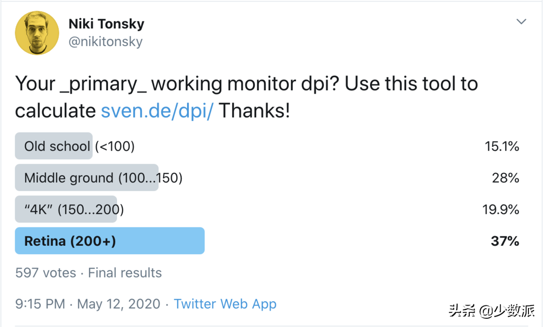 根据我在 程序员、开发者中的调查,我发现 43% 的人依旧在使用屏幕显示密度低于 150 PPI 的显示器。