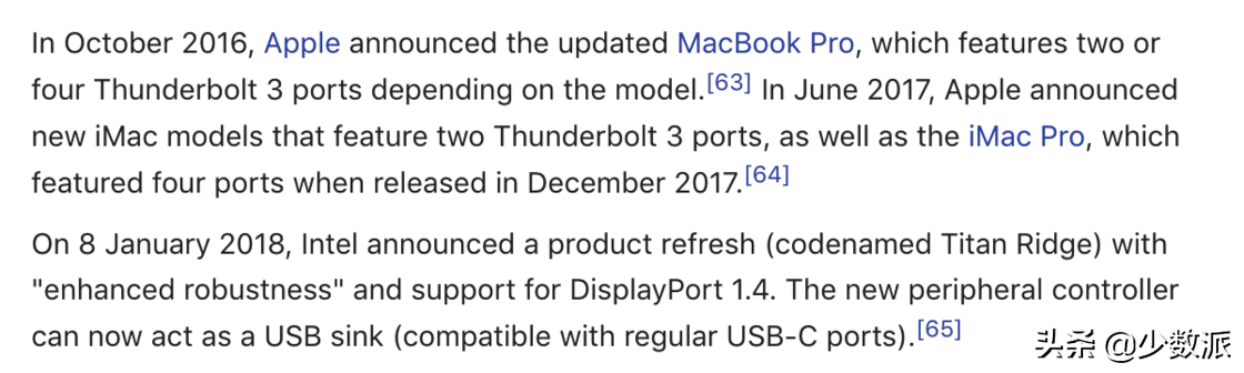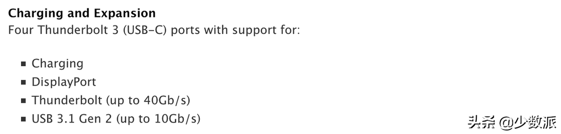之后它又说「DisplayPort over USB-C」(可我们有的是雷电 3 不是 USB-C 啊!),然后它也没有具体说 DisplayPort 的版本,可是如果我们不知道具体版本号,那这信息就是完全无用的啊。另外它还说 USB 3.1 Gen 2 被限制在 10Gb/s 了,不过我猜 USB 3 的限制并不会限制到 USB-C?还有,USB 3.1 Gen 2 是什么鬼个名字啊?是 USB 3.2 已经用过了?