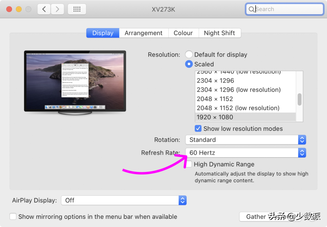 但是即使你有合适的 Mac,你的 Mac 有合适的端口和合适的线缆,这也不够。每次我打开 Mac 之后,我都必须经过一系列操作才能把我的显示器切换到 120Hz 模式: