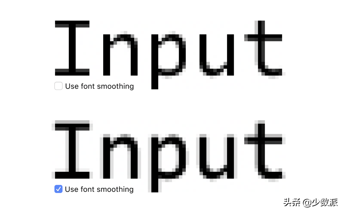那么这对于我们开发者来说意味着什么呢?如果我们拿一个专为某个特定像素大小徒手设计优化的字体来看(大多数编程字体,比如 11px 大小的 Input 字体、12px 大小的 Monoid 字体,都是这样的),那么这些字体尽管做了种种努力,依旧会被渲染得非常模糊。