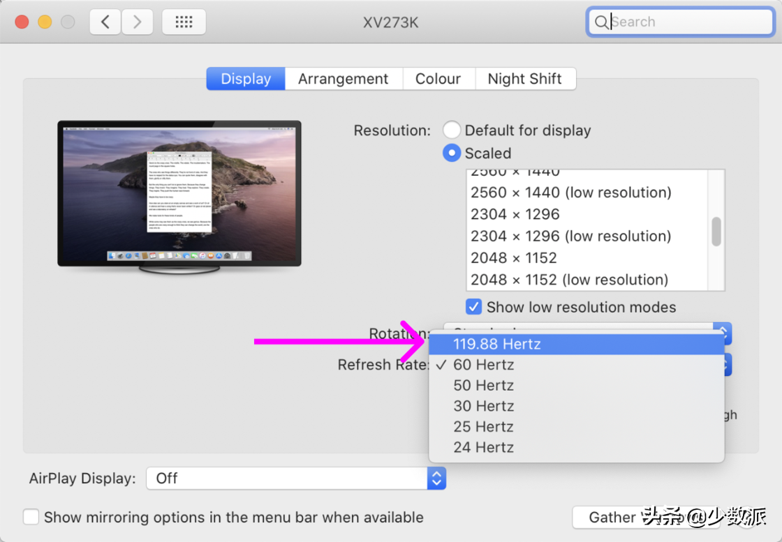 完整重启进入 macOS,此时显示模式默认设置为 60Hz;进入「系统设置 » 显示」;按住「Alt / Option」按键时(⌥ 按键),选择分辨率下的「缩放」;这里为什么是 119.88Hz 而不是 120Hz 呢?我也不知道,但看起来工作方式都是一致的。为什么 macOS 不能记住这一选项呢?我也不知道。为什么我得把显示器关闭再打开才能让 macOS 识别到 120Hz 呢?我也不知道!最重要的问题是,这个 120Hz 的选项不一定总会出现,但是经过这里的一系列操作之后,它可能会识别到 120Hz 的选项,而且如果一旦识别到了,那大概率设置上就好了。