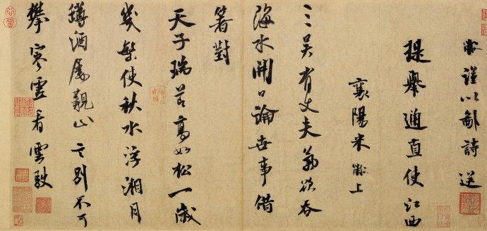 黻谨以鄙诗送 提举通直使江西 襄阳米黻上 三吴有丈夫 气欲吞 海水 开口论世事 借箸对天子 瑞节高如松 —岁 几繁使 秋水浮湘月 罇酒屡觏止 言别不可攀 寥虚看云驶