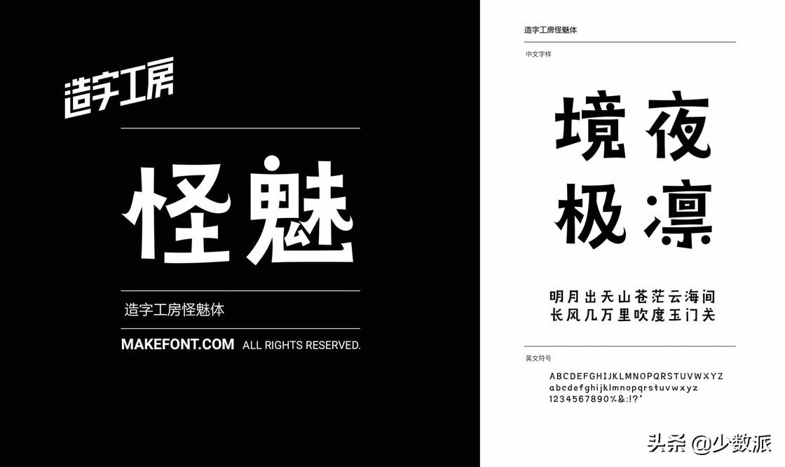 设计者:造字工房版权: 个人非商用字形数:GB2312「很久很久以前,在一个充满魔法的大地……」怪魅体是中文字体中比较少见的哥特风字体,每个字的装饰元素非常多:圆形的点,崎岖的笔画,末端的弯钩等等细节都预示着一个传说故事即将展开。这款字体适用于有关传说和魔法的场景。造字工房曾为上海迪士尼定制园区中游乐项目的字体,你能在其中发现很多这款字体的影子。