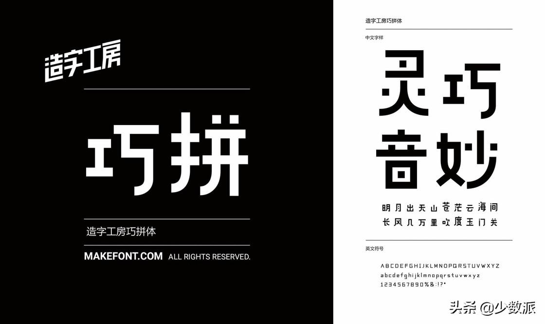 设计者:造字工房版权: 个人非商用字形覆盖:GB2312笔画横平竖直,圆弧规整,字形却不刻板,这些都是玩具带给我们的感觉。巧拼体像是一个由七巧板和积木拼搭出来的字体,虽然有棱有角但没有一点的攻击性。造字工房巧拼字体适用于儿童相关的场景,尤其是于玩具相关的话题。