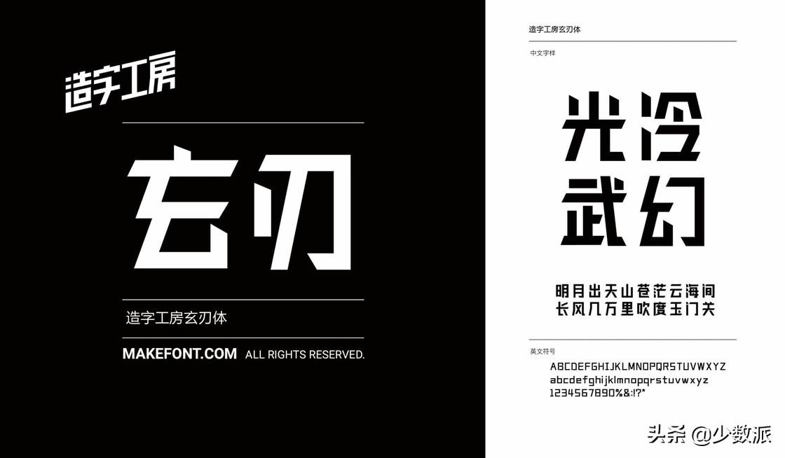 设计者:造字工房版权: 个人非商用字形覆盖:GB2312如果宣发材料上出现「秒杀友商」之类的字,用这款字体没错了。玄刃的笔画非常刚劲,横画的斜切处理让笔画像刀一样锋利,是这个字体的精髓。玄刃体看上去锋利果敢,适用于竞技和科技场景。