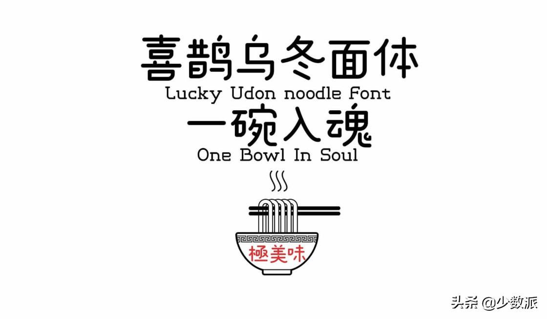 设计者:喜鹊造字版权: 个人商用(¥99)字形覆盖:GB2312圆头和粗细一致的设计让这款字体看起来像一碗乌冬面,柔软却有型。乌冬面体的笔画长度和空间安排都多了一些随意,这种错落感给字体增加了可,毕竟乌冬面在碗里的时候就是这样的。这款由喜鹊造字打造的字体仍然只需要 99 元,适用于卡通和美食场景,尤其与面食相关的东西。